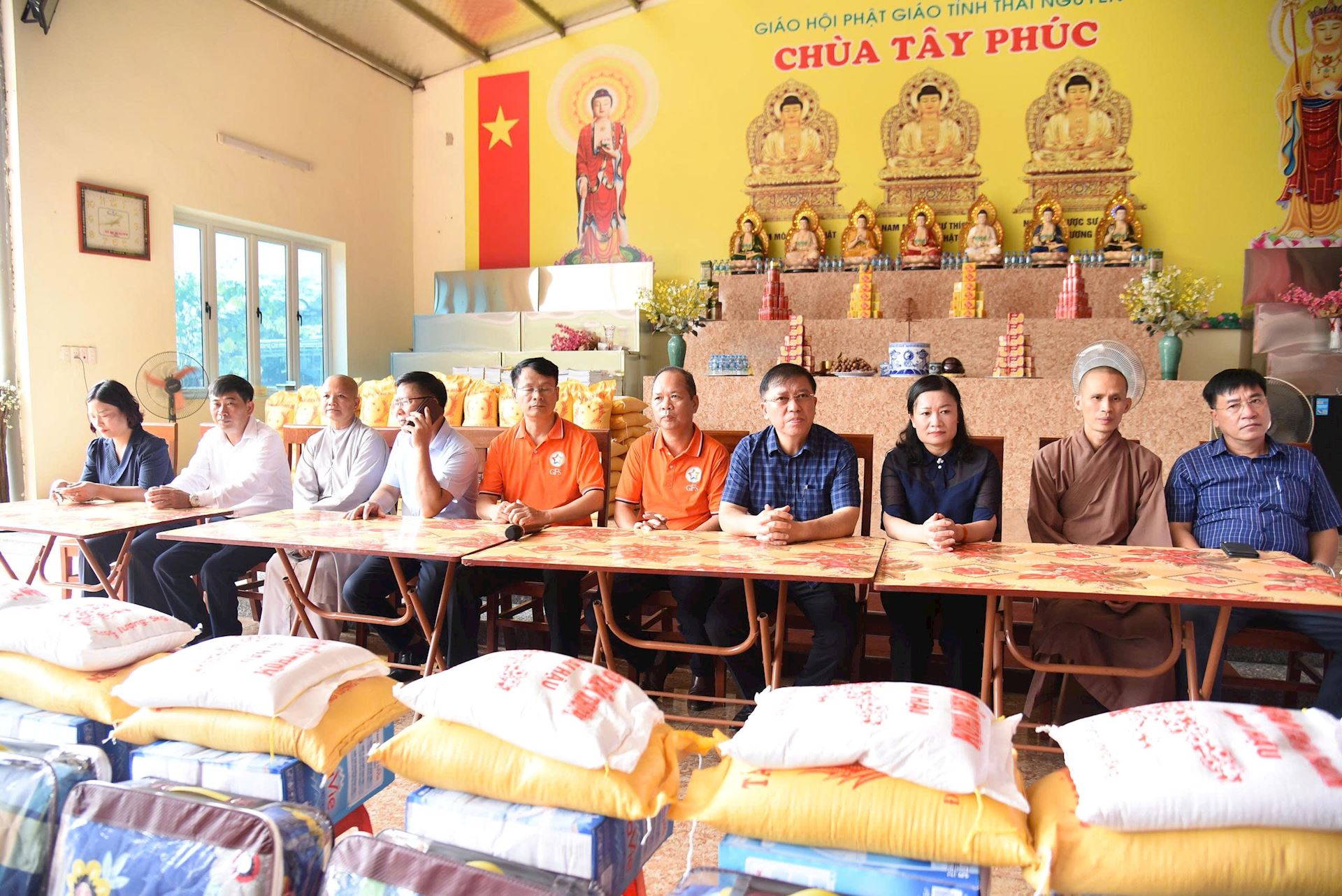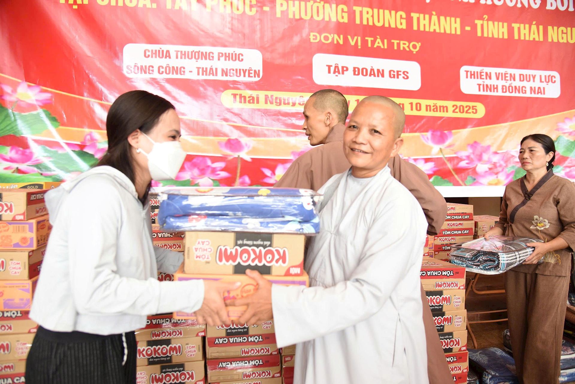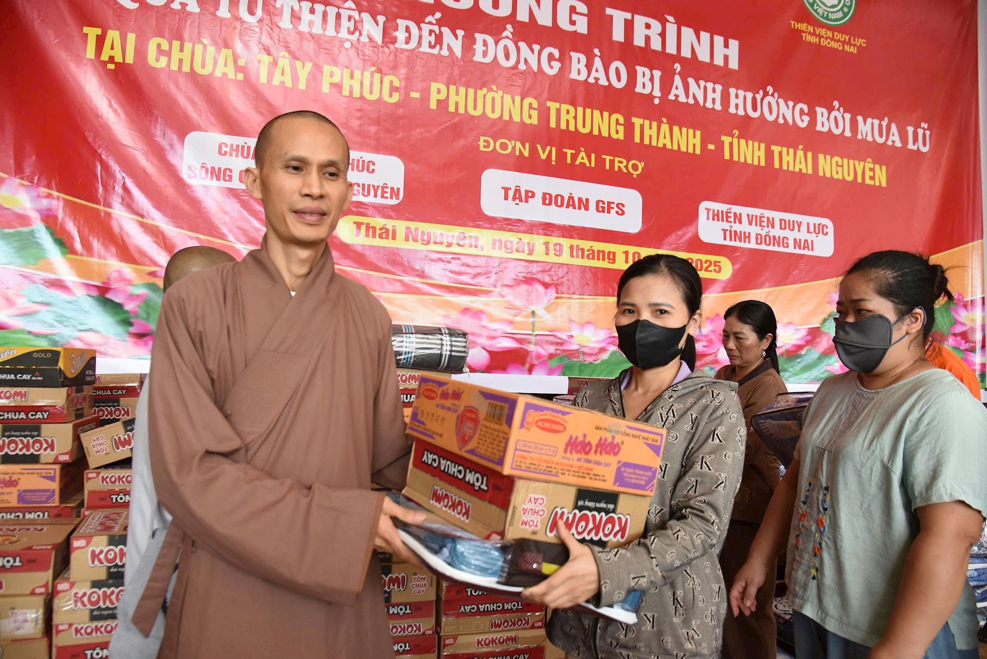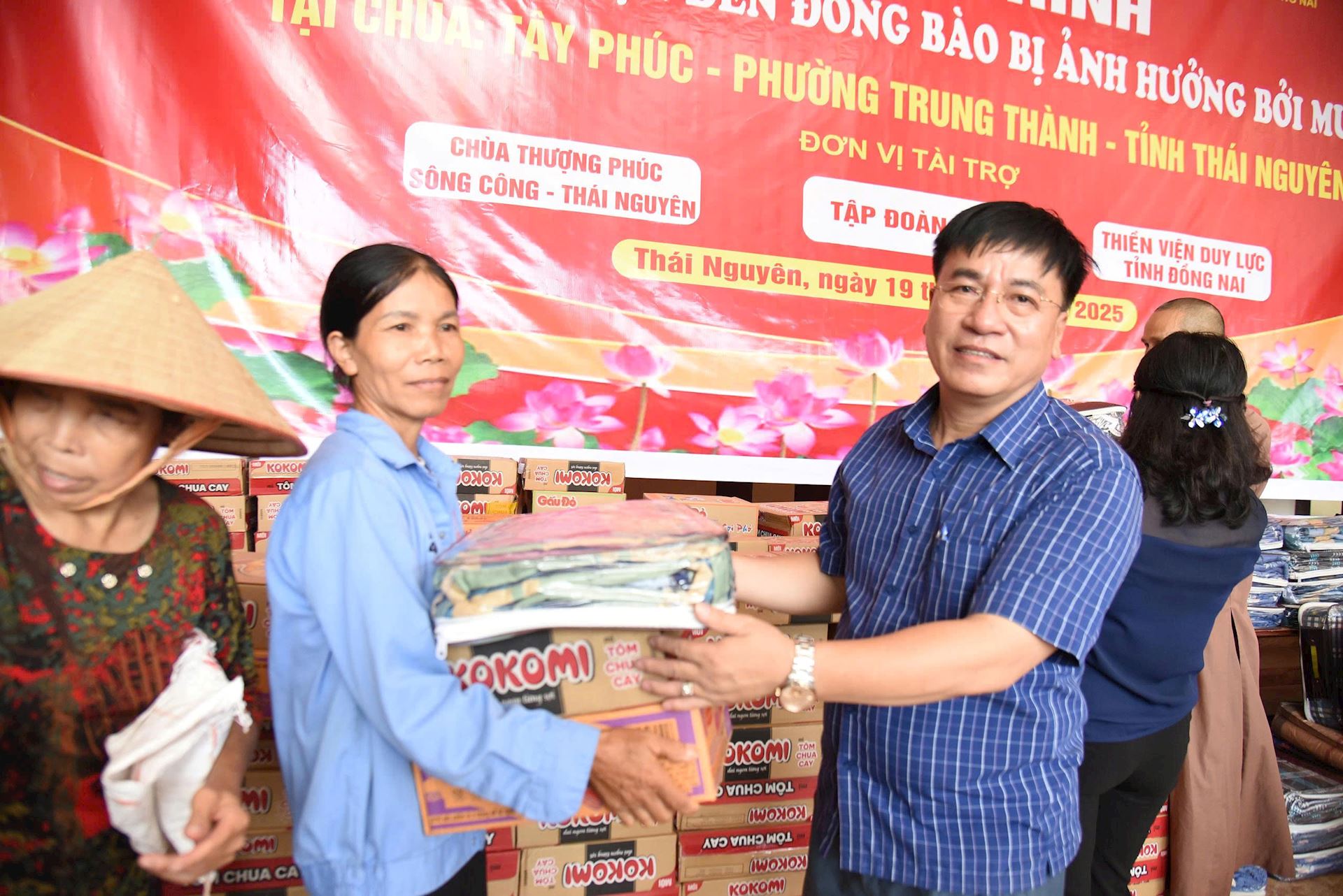 Các đại biểu trao quà cho bà con chịu thiệt hại nặng nề do lũ lụt gây ra tại chùa Tây Phúc, phường Trung Thành, tỉnh Thái Nguyên