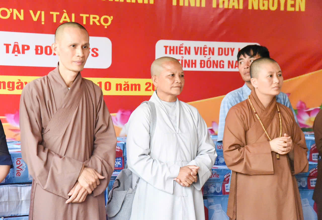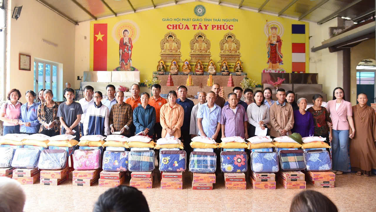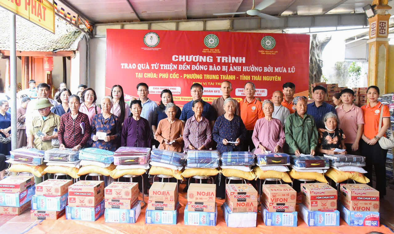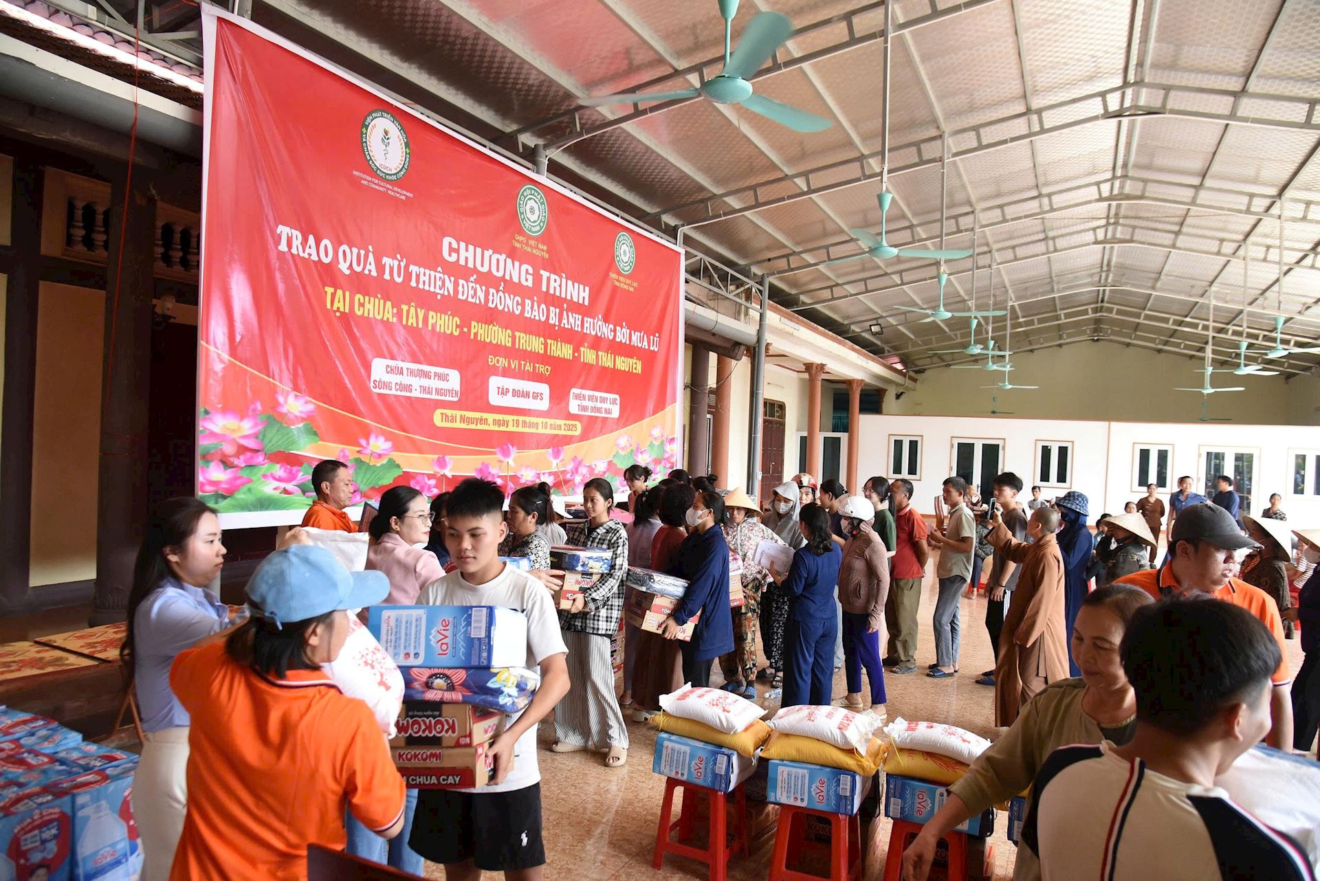 Các đại biểu trao quà cho bà con chịu thiệt hại nặng nề do lũ lụt gây ra tại chùa Tây Phúc, phường Trung Thành, tỉnh Thái Nguyên