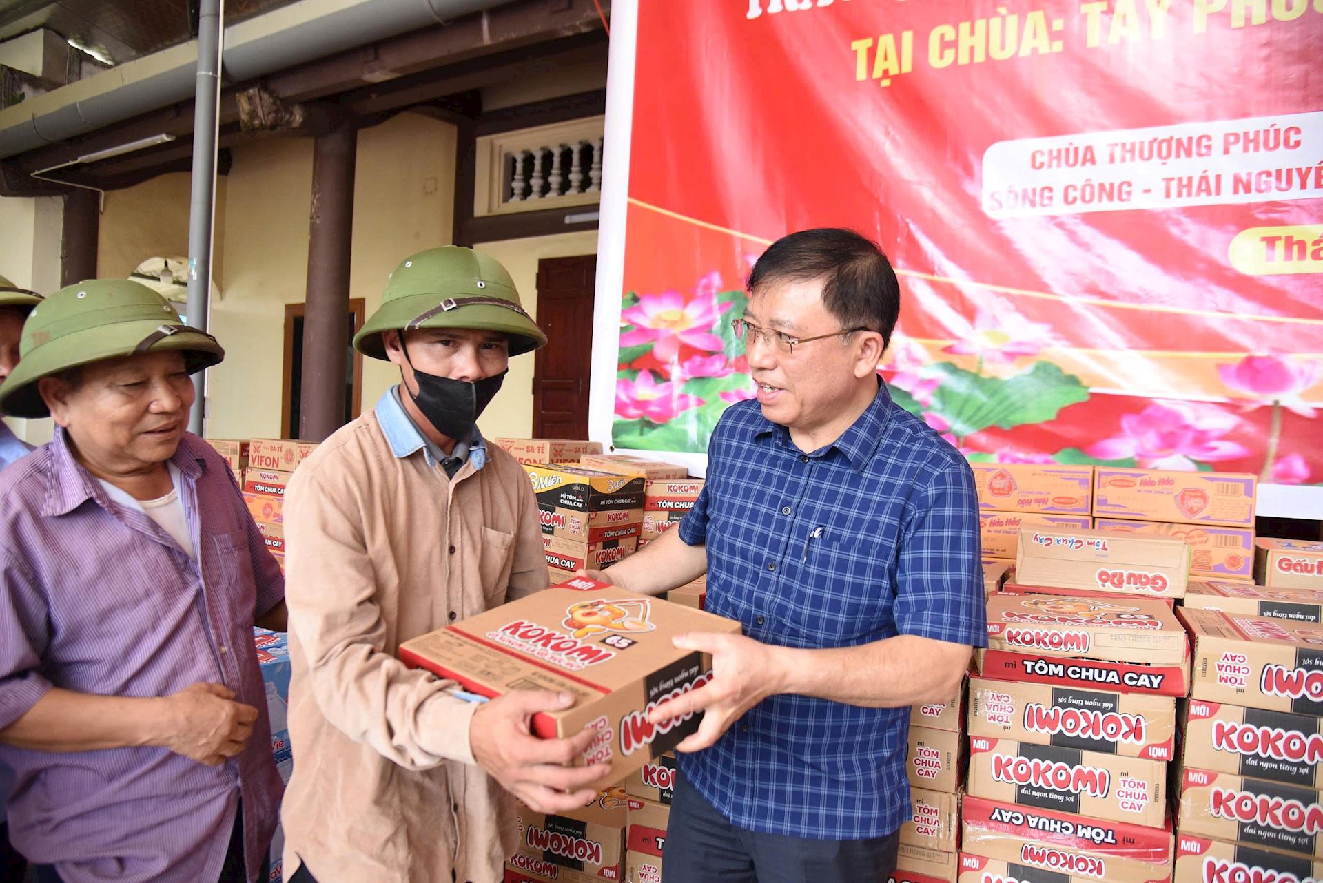 Các đại biểu trao tặng quà cho bà con chịu thiệt hại nặng nề do lũ lụt gây ra tại chùa Tây Phúc, phường Trung Thành, tỉnh Thái Nguyên
