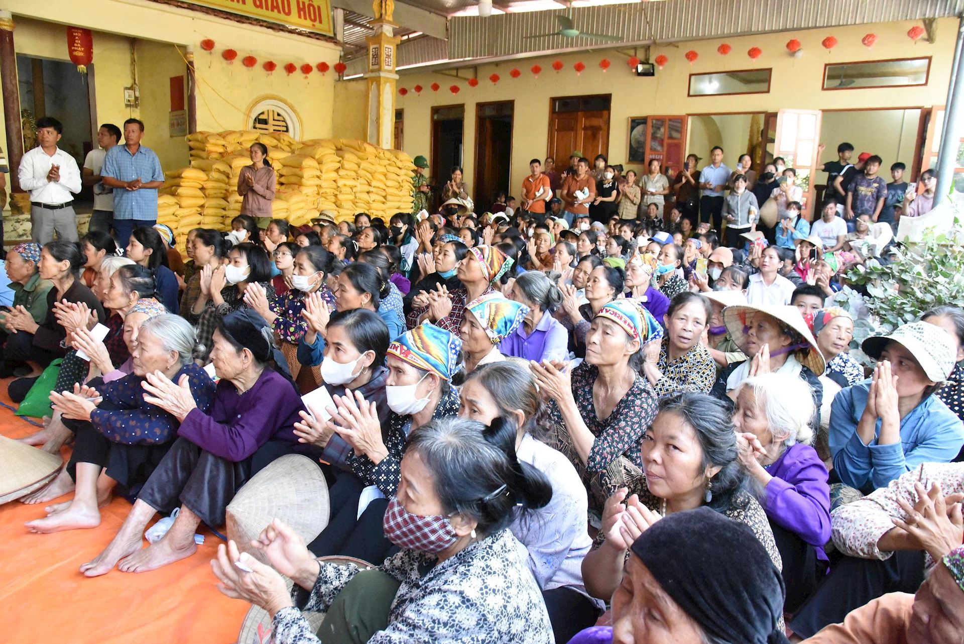 Các đại biểu tham dự chương trình trao quà cho bà con chịu thiệt hại nặng nề do lũ lụt gây ra tại chùa Tây Phúc, phường Trung Thành, tỉnh Thái Nguyên