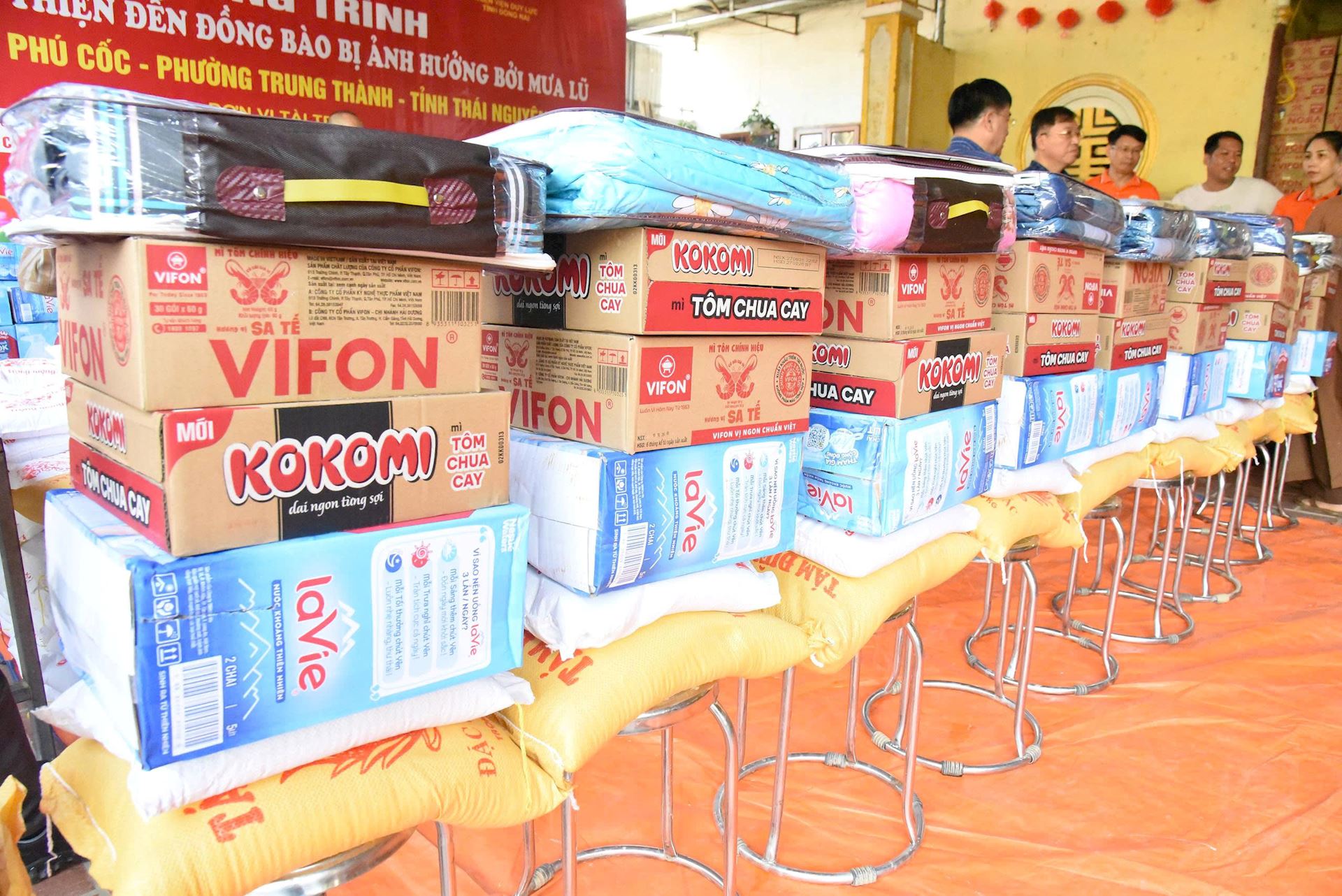 Mỗi suất quà gồm: 15kg gạo, 2 thùng mì, 1 thùng nước và 1 bộ chăn được trao tặng đến nhân dân phường Trung Thành, tỉnh Thái Nguyên