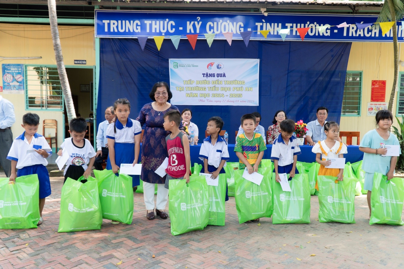 Nhà giáo Đặng Thị Ngọc Bích - Hiệu trưởng TH-THCS-THPT Phan Chu Trinh Tặng quà tiếp sức đến trường tại Trường Tiểu học Phú An, Năm học 2024-2025
